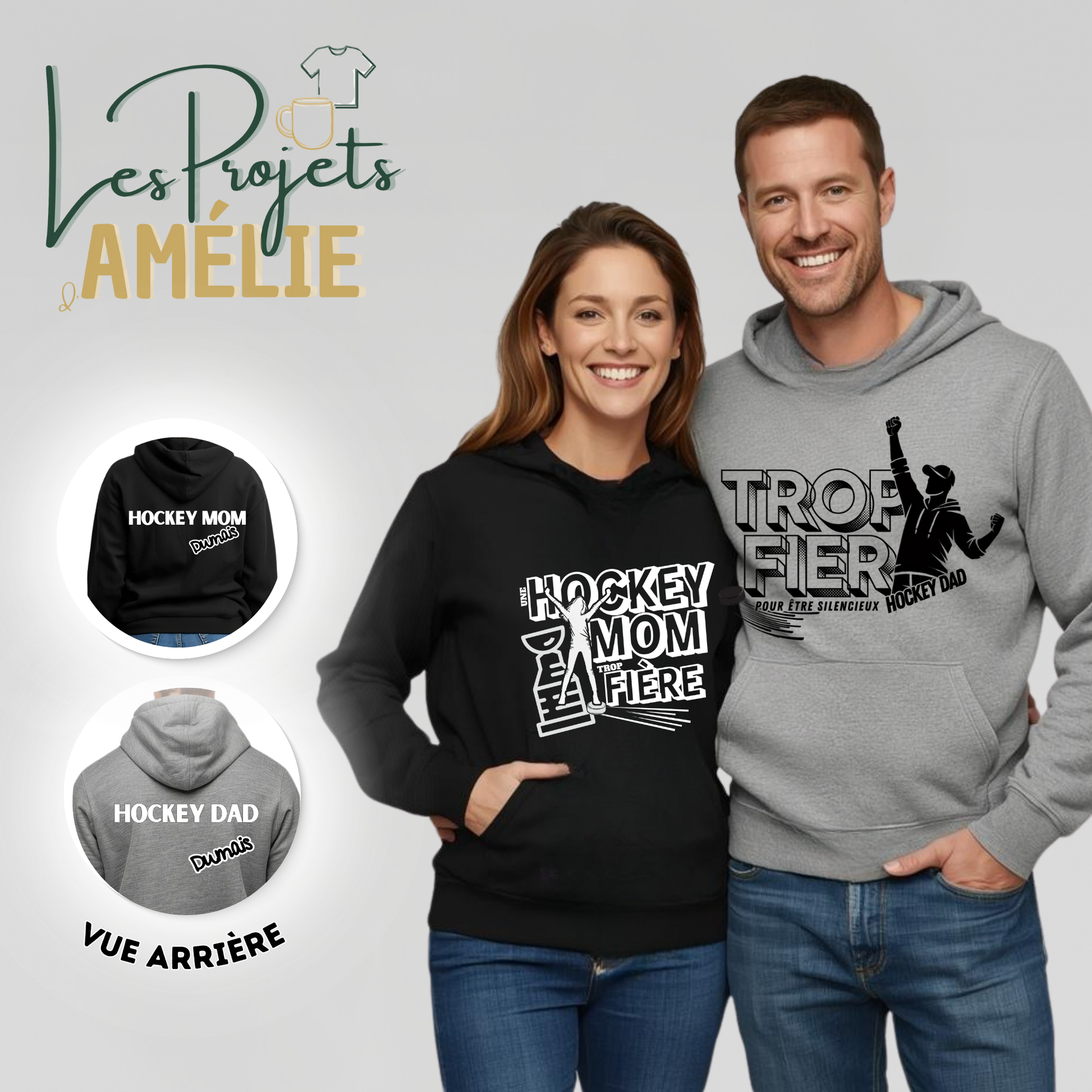 Au dos, la mention « Hockey Dad » ou « Hockey Mom» personnalisée avec votre nom ajoute une touche unique et fièrement assumée.