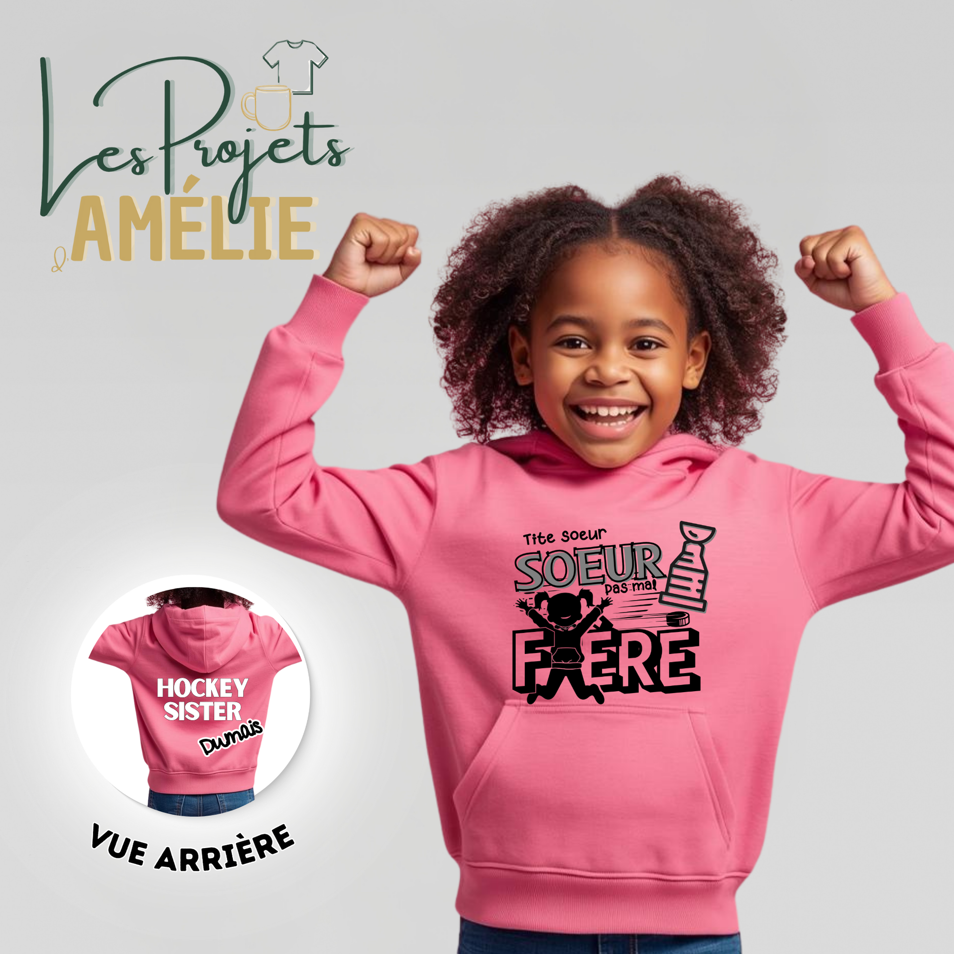 Parce que la fierté de l’aréna se vit aussi chez les plus jeunes, voici le hoodie « Tite sœur pas mal fière » ! 💖🏒